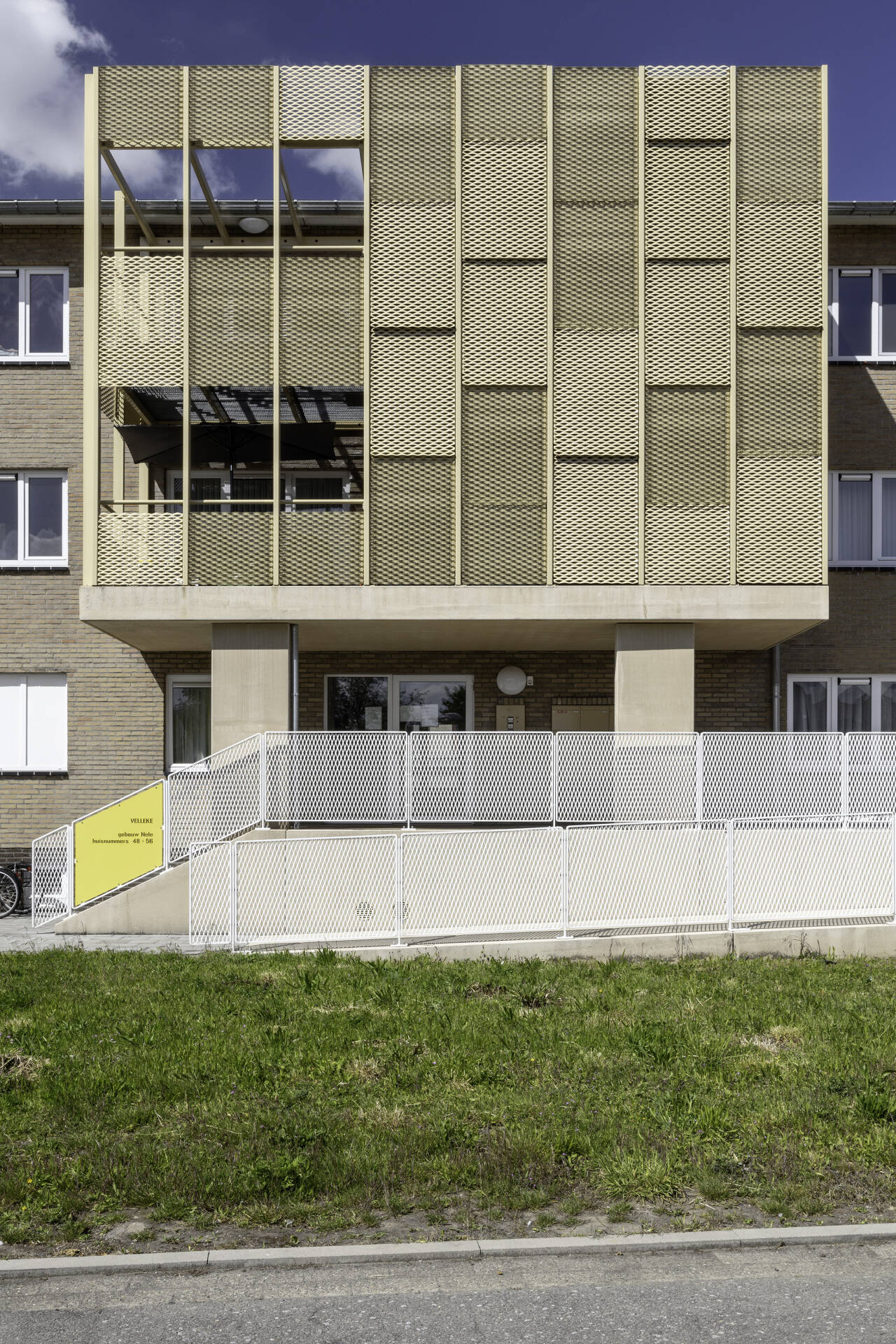 Drie bestaande woongebouwen van huisvestingsmaatschappij Geelse Huisvesting worden gestript tot op de ruwbouwstructuur. Een uitbreiding zorgt voor de nodige extra ruimte. De nieuwe terrassen zijn opgevat als een vrijstaande staalconstructie afgewerkt met semi doorzichtige panelen van gerekt metaal. Het trio krijgt nieuwe toegangspartijen met een fris uiterlijk waarbij trendy terrazzo vloertegels en de warmgele trapleuning in gebogen staalplaat allure geven aan de collectieve ruimtes. Enkele appartementen kunnen ‘op maat’ aangepast worden voor bewoners met een fysische beperking.
